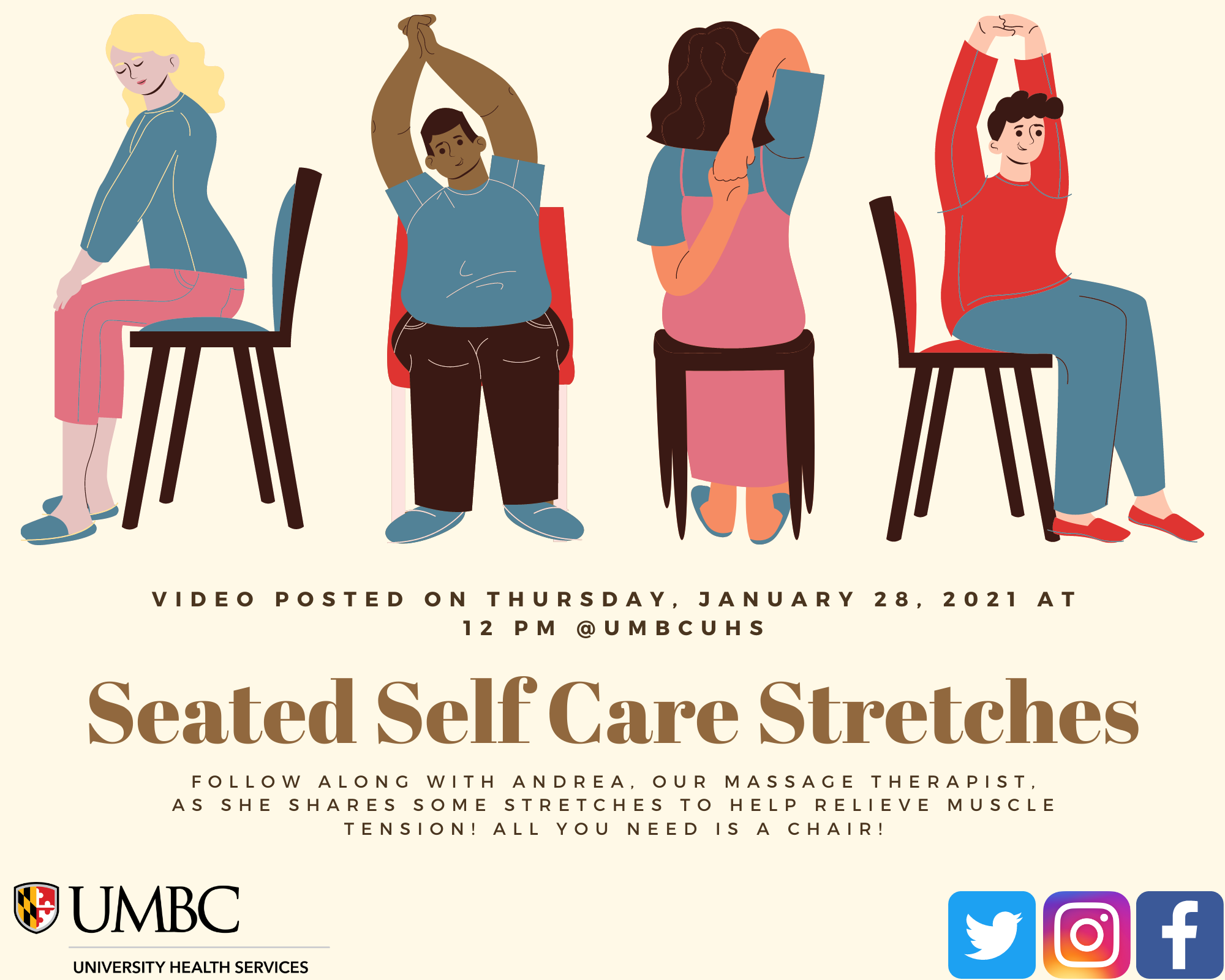 Follow along with Andrea, our massage therapist, as she shares simple stretches to relieve muscle tension. These stretches can easily be incorporated into your busy schedule! Follow @umbcuhs on Facebook, Twitter, Instagram, or myUMBC to view the video!