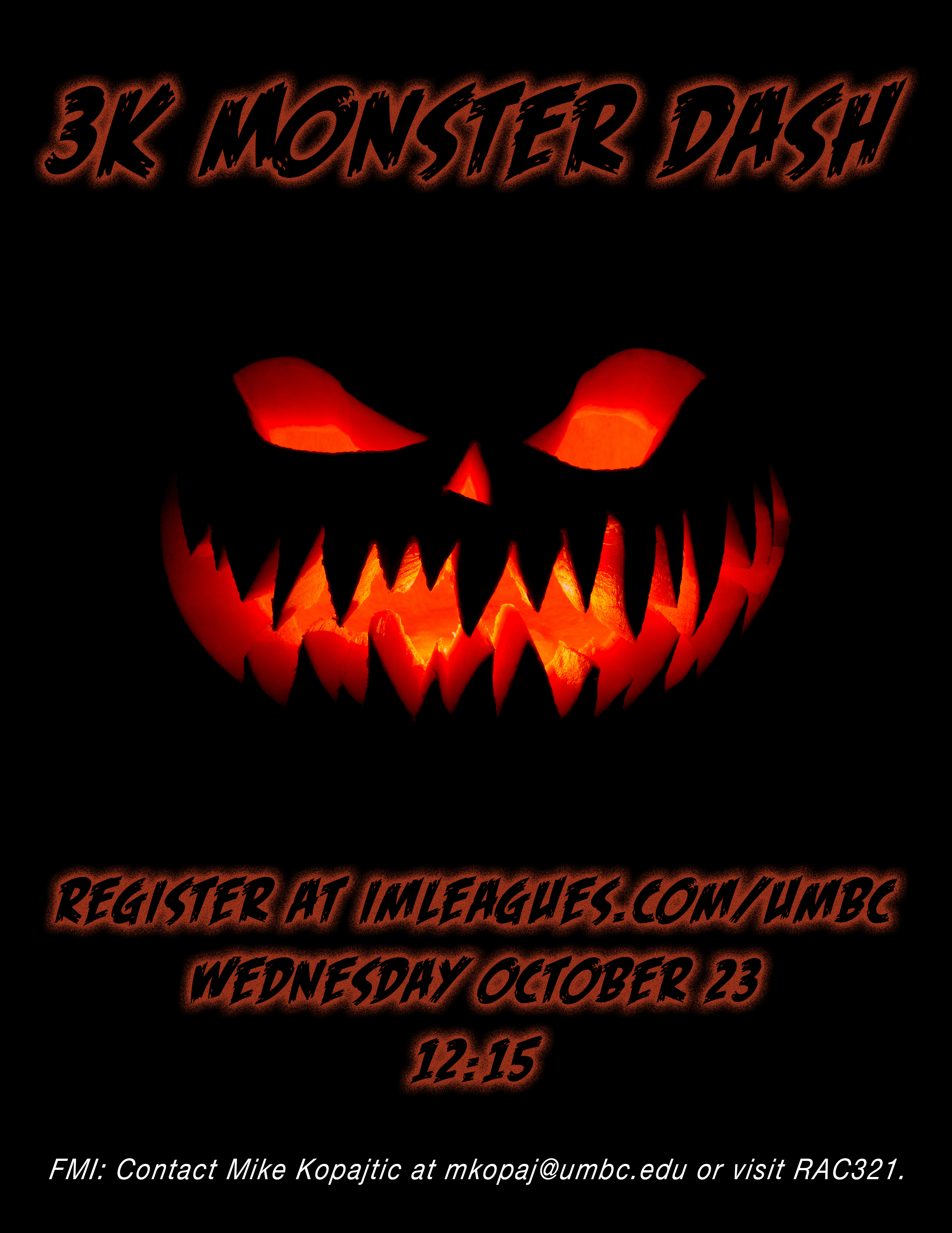 UMBC Intramural Race Series will be offering two races this semester. The first race is a 3K Monster Dash that will be held on Wednesday, October 23rd, starting at 12:15PM.
