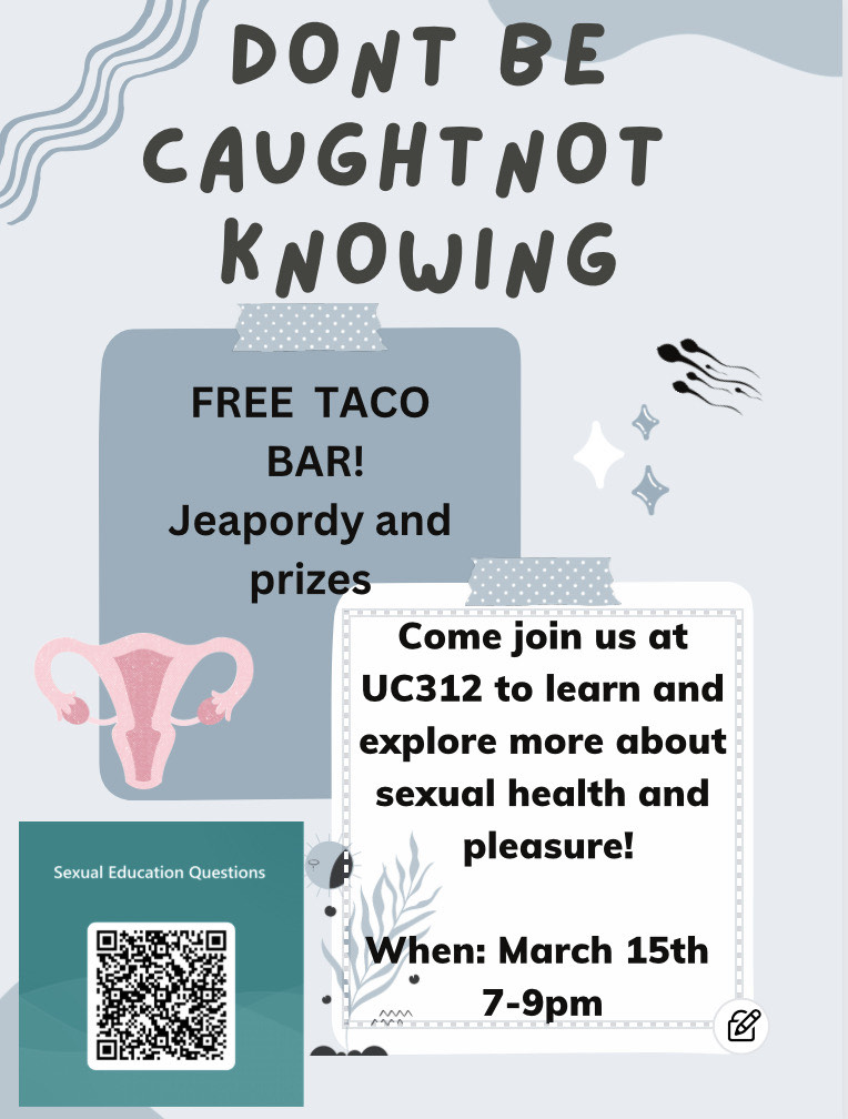 Join WILL+ for a night to learn about sexual health and talk about sexual pleasure in a fun and safe environment. We'll play some Jeopardy, hand out some prizes, answer some questions, and eat free food that's not pizza. That's right--we're having a taco bar!