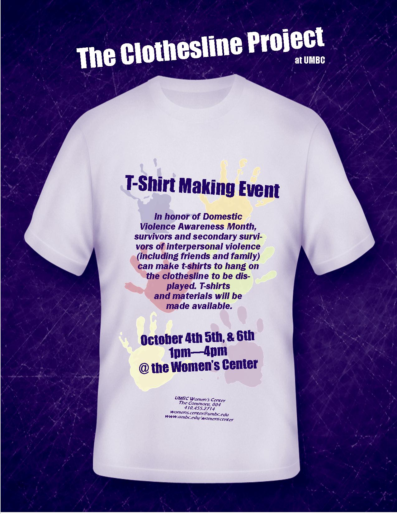 In honor of Domestic Violence Awareness Month, survivors and secondary survivors of interpersonal violence (including friends and family) can make anonymous t-shirts to hang on The Clothesline Project (TCP) display that will take place on Tuesday, October 11th on the Commons Main Street from 1pm - 3pm. T-shirts and materials to decorate shirts with will be made available to participants.