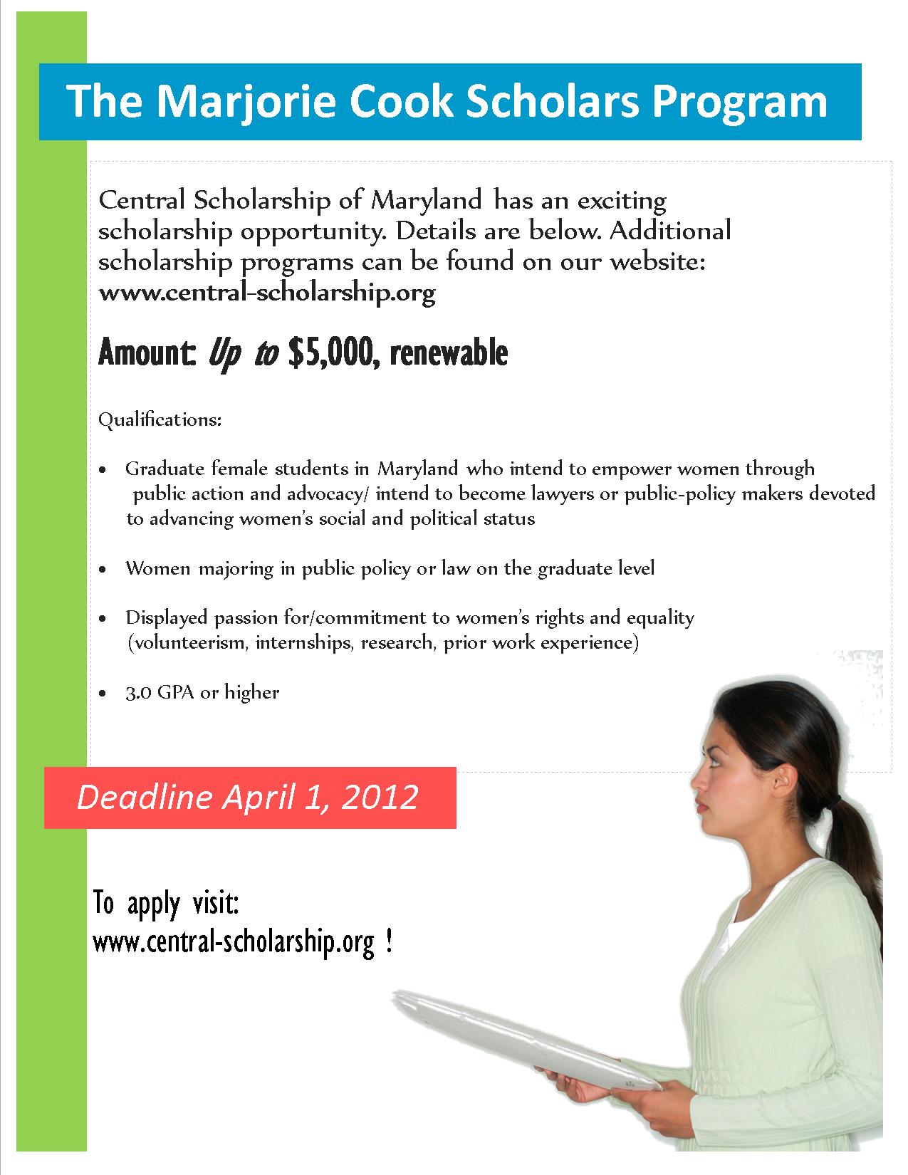 - Graduate female students in Maryland who intend to empower women through public action and advocacy/ intend to become lawyers or public-policy makers devoted to advancing women’s social and political status