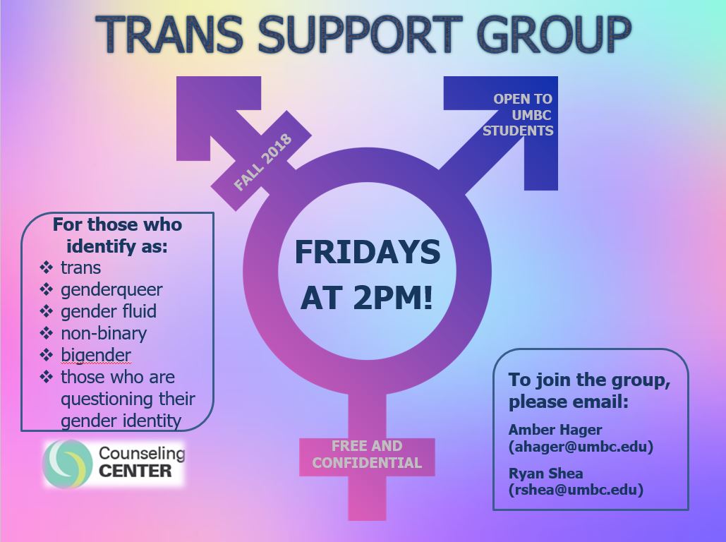 The Trans Support Group run through the Counseling Center is for students who identify as trans, genderqueer, gender-fluid, non-binary, bigender, and those who are questioning their gender identity.