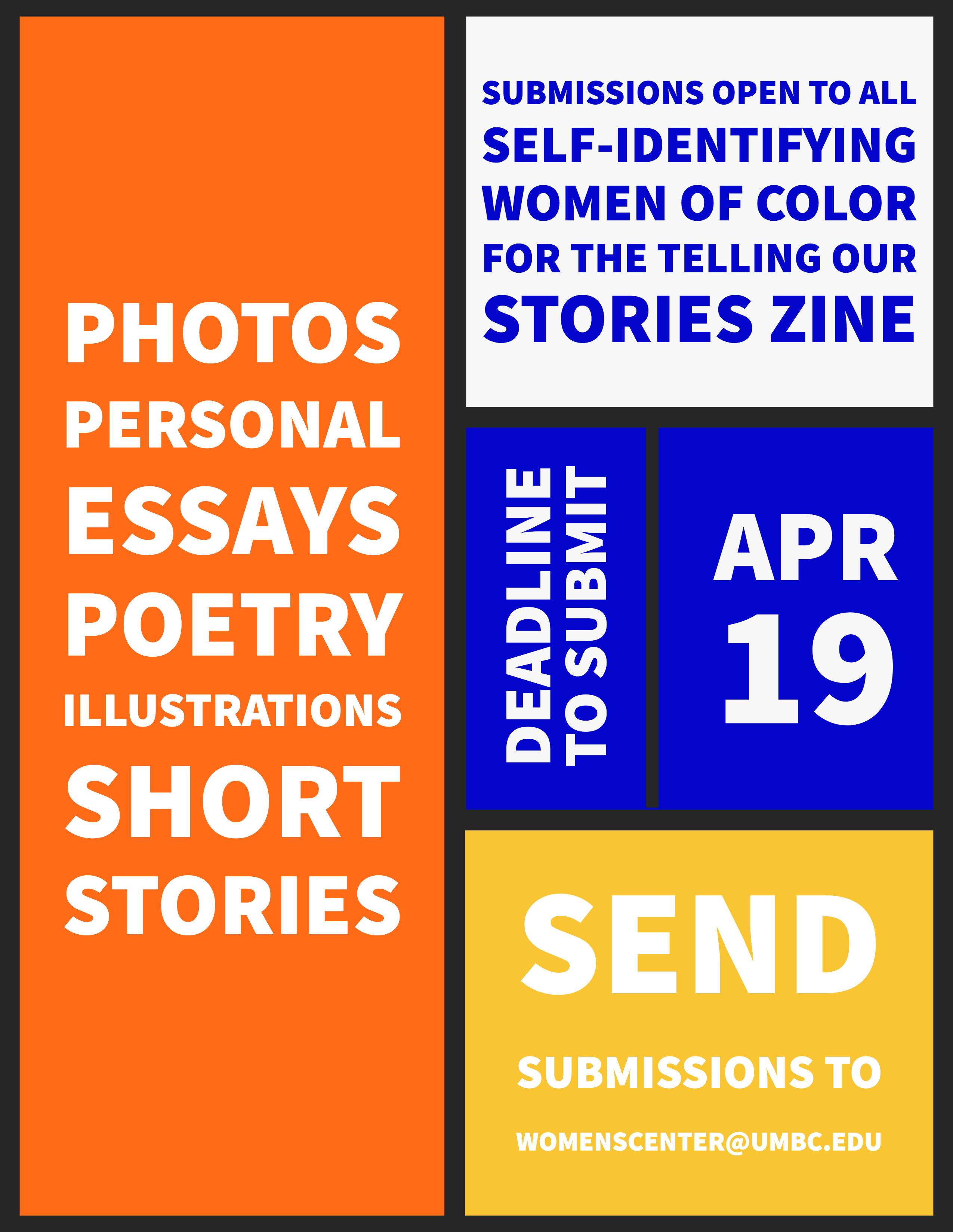 We are accepting photos, personal essays, poetry, illustrations, and short stories to be included in our published Telling Our Stories Zine! Please submit your creative work to womenscenter@umbc.edu. The deadline to submit is: April 26, 2019.